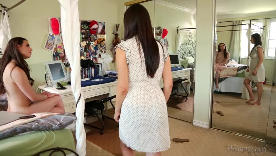 Casey sets up her phone on her bureau, activating the video recorder. She calls in Jelena, heckling her for some more lesbian anatomy lessons. Casey's pulls her mother's dress to the side, sucking of her boobs, however, Jelena has her head on straight, and tells Casey play time is over and it is time to study. But Casey shows that she's caught mommy's boobs on camera, bribing Jelena to fuck her right now, or she will expose everything. Casey's turn to give Jelena an anatomy lesson!